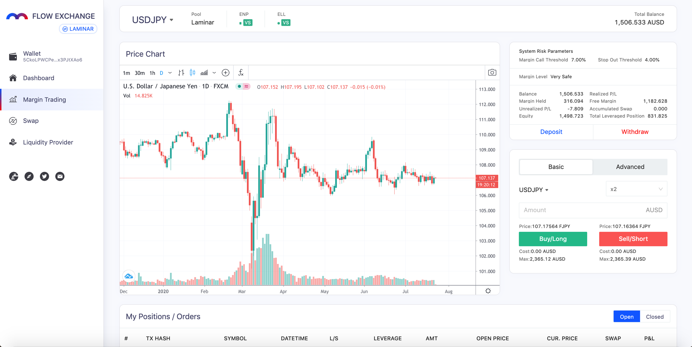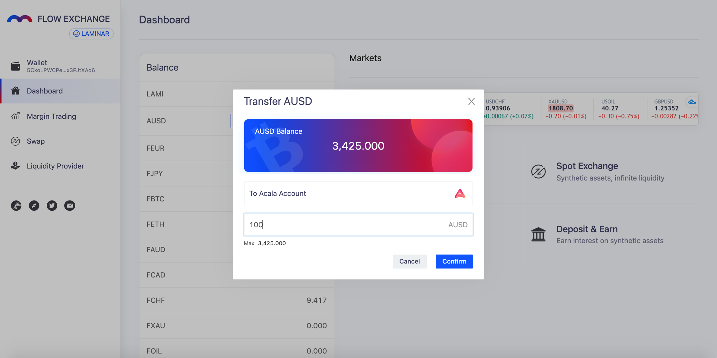 aUSD can be transferred to the Laminar Chain for margin trading synthetic forex pairs e.g. EURUSD, gold and stocks, and synthetic BTC & ETH.