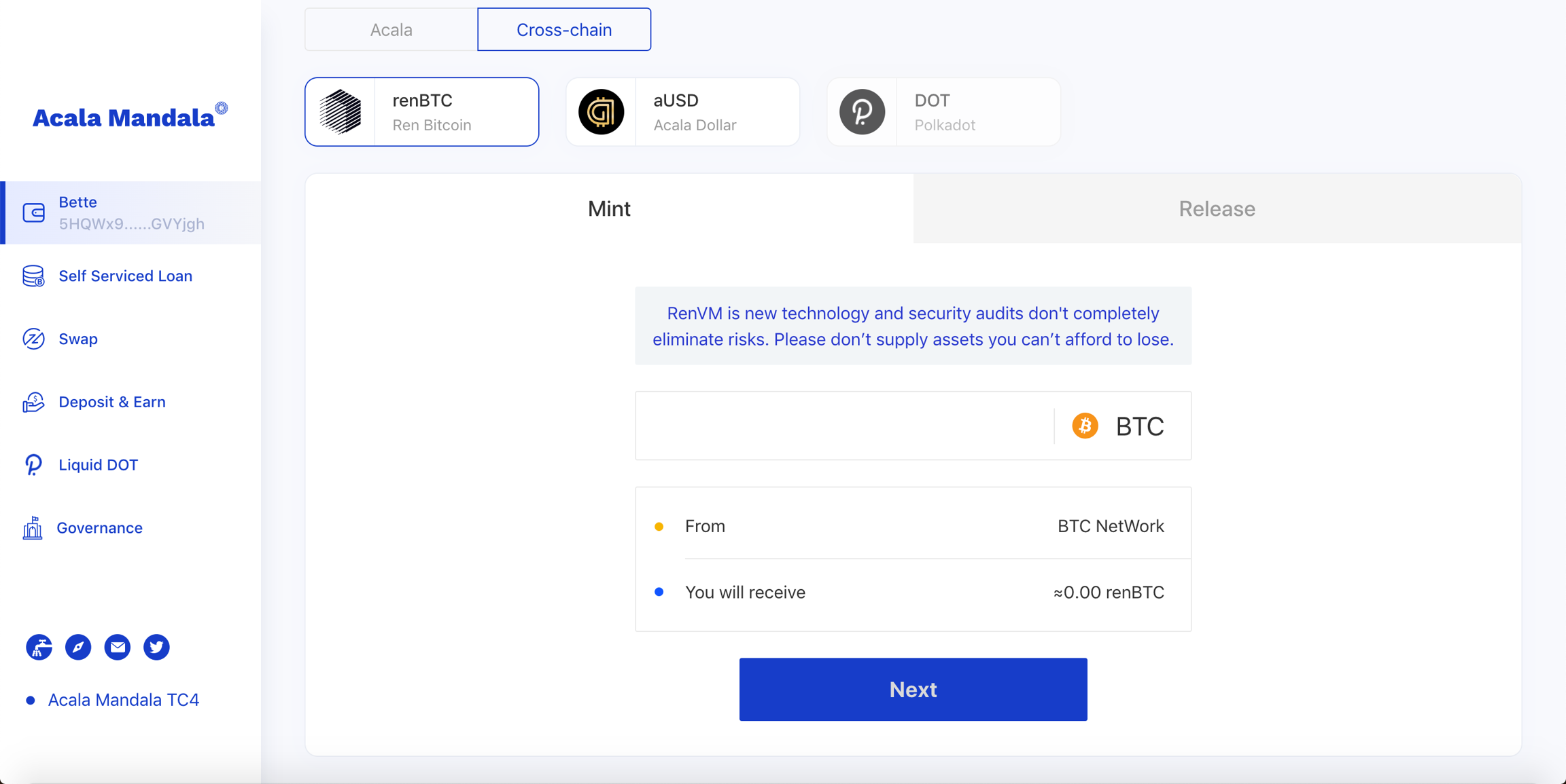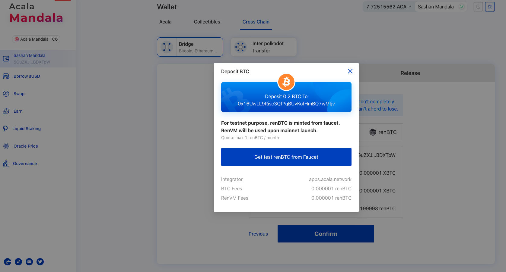 On Mandala testnet, the faucet drips 0.2 renBTC each time, and capped at 1 renBTC/month/user. Upon canary network and mainnet, RenVM will be used for minting and burning renBTC.