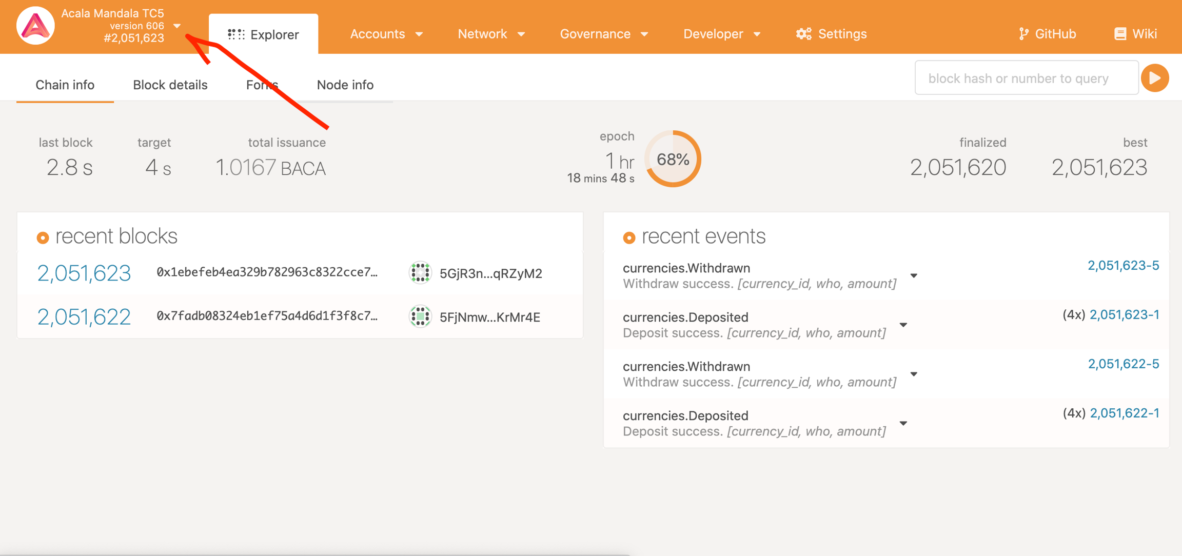 Polkadot Explorer is used to communicate with an Acala Node, where you can query the state of the blockchain e.g. balances of accounts, block information etc., and execute transactions to interact with various runtime modules of the chain e.g. transfer a token, do a token swap on the DeX etc.