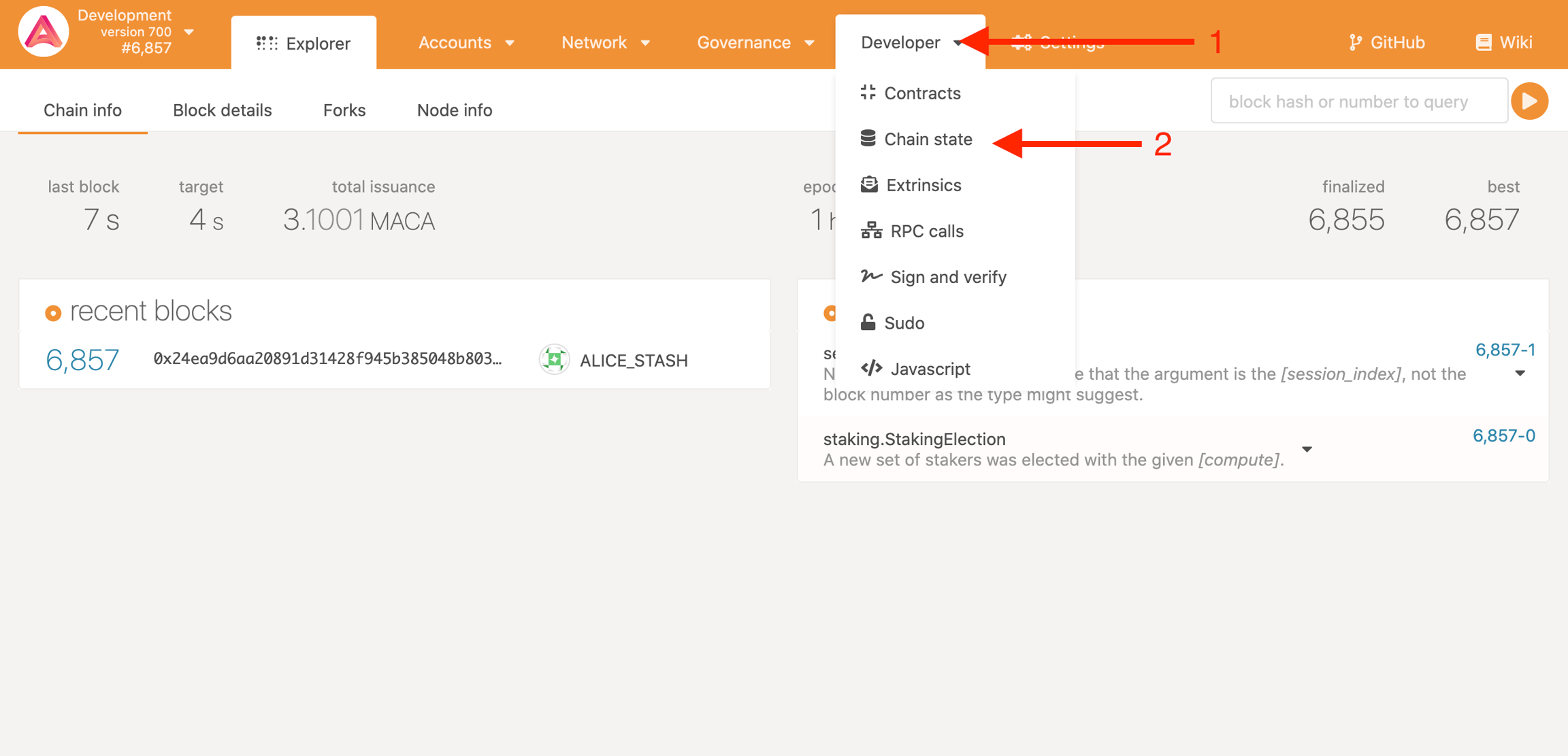 Click the Developer tab on the top navigation bar, and select Chain State in the dropdown list.
