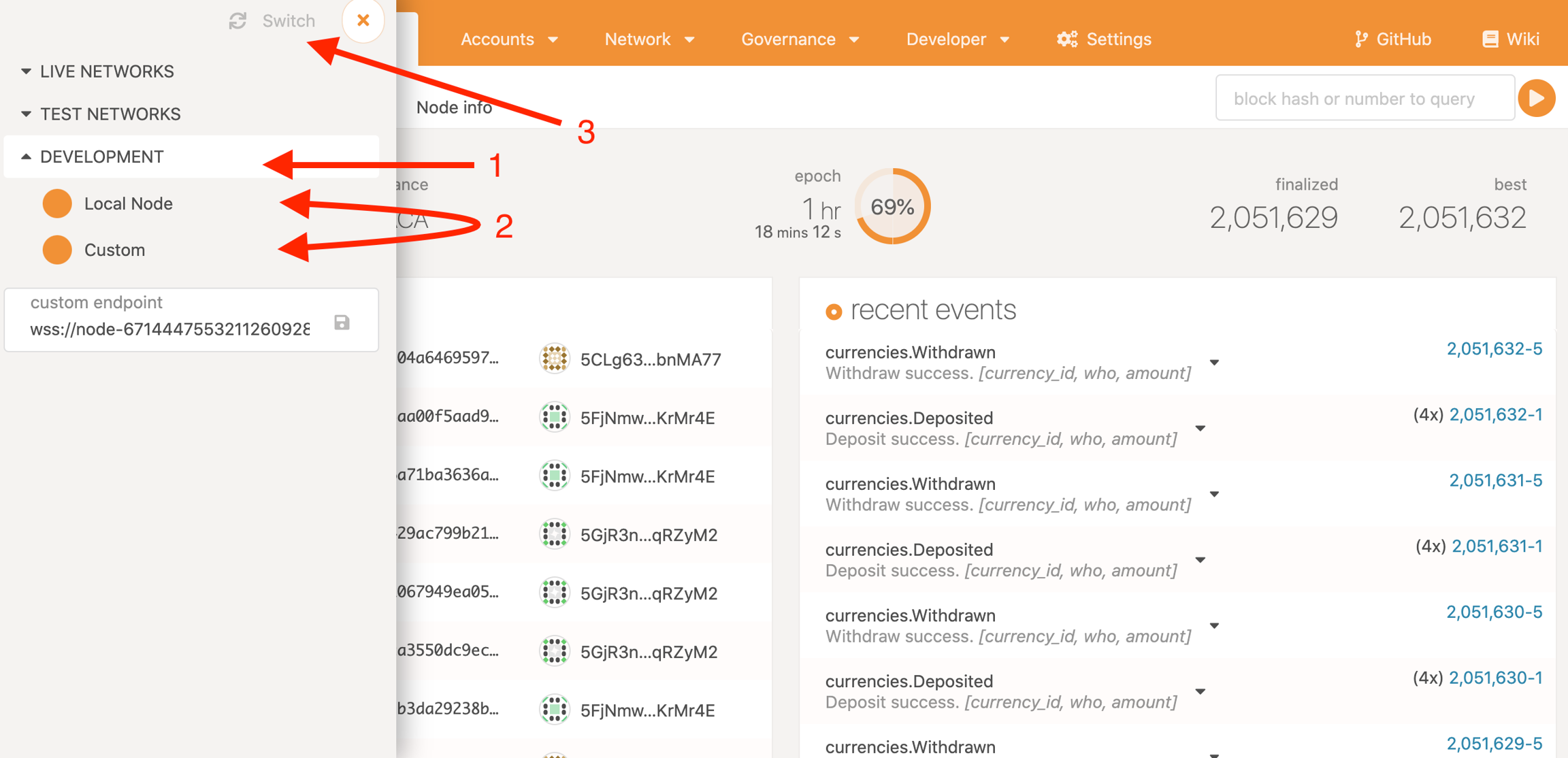 Select Custom to connect to a deployed node, and paste the Websocket URL to the custom endpoint input box. You can find deployed nodes here.