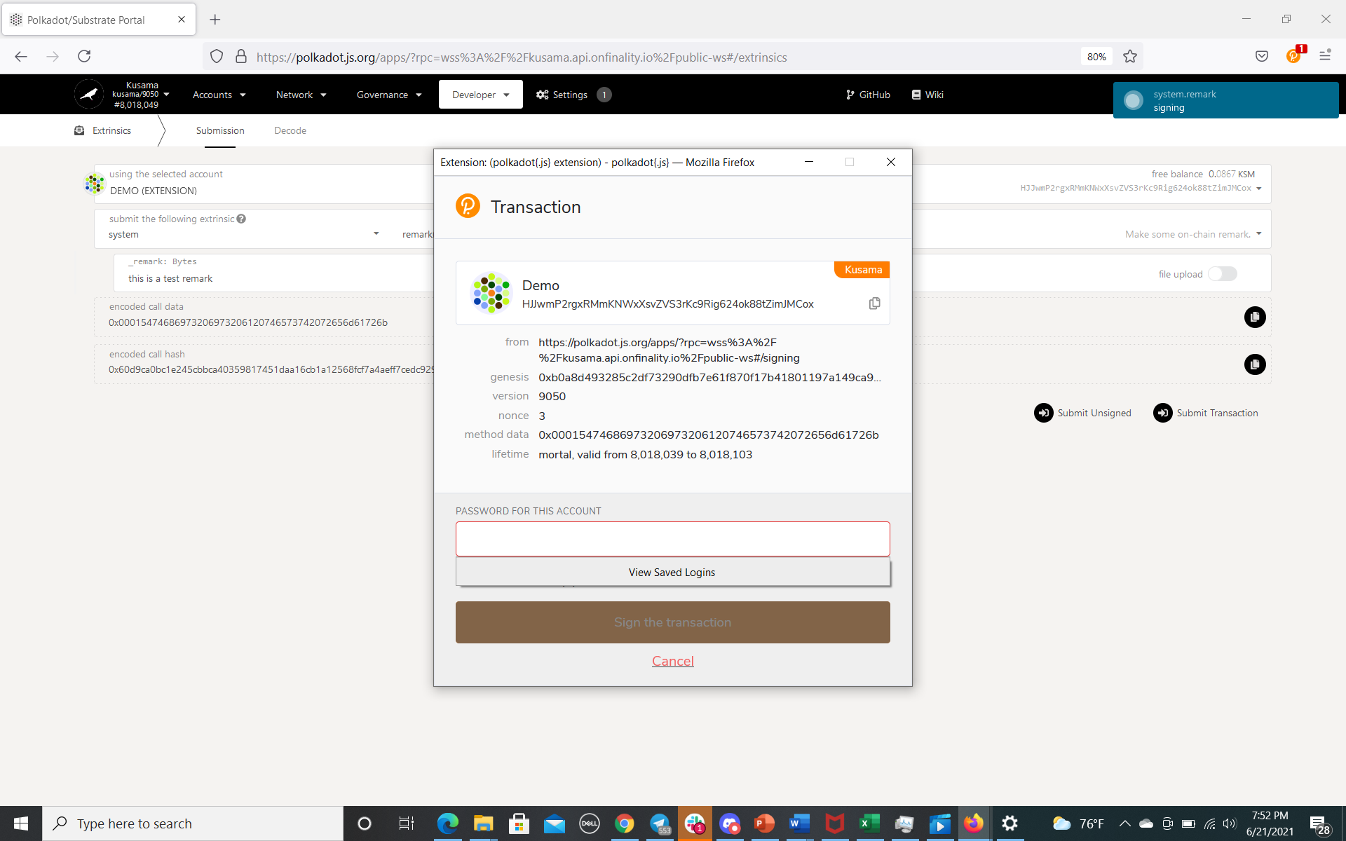 Send a System Remark on Kusama with a specific message OR
