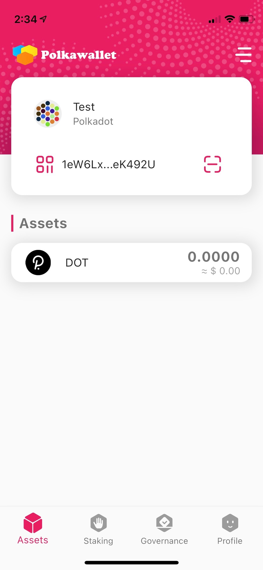 Now your wallet is set up and you can copy your Polkadot address. You can see that your wallet changed color to black and among your assets you can see DOT.