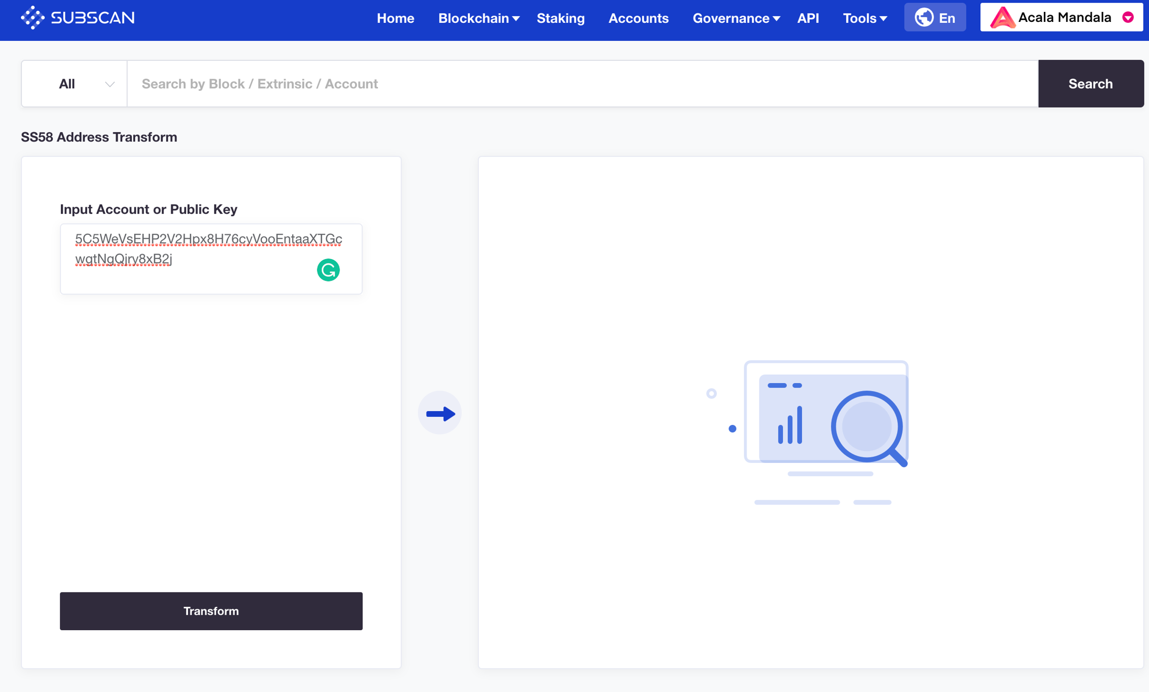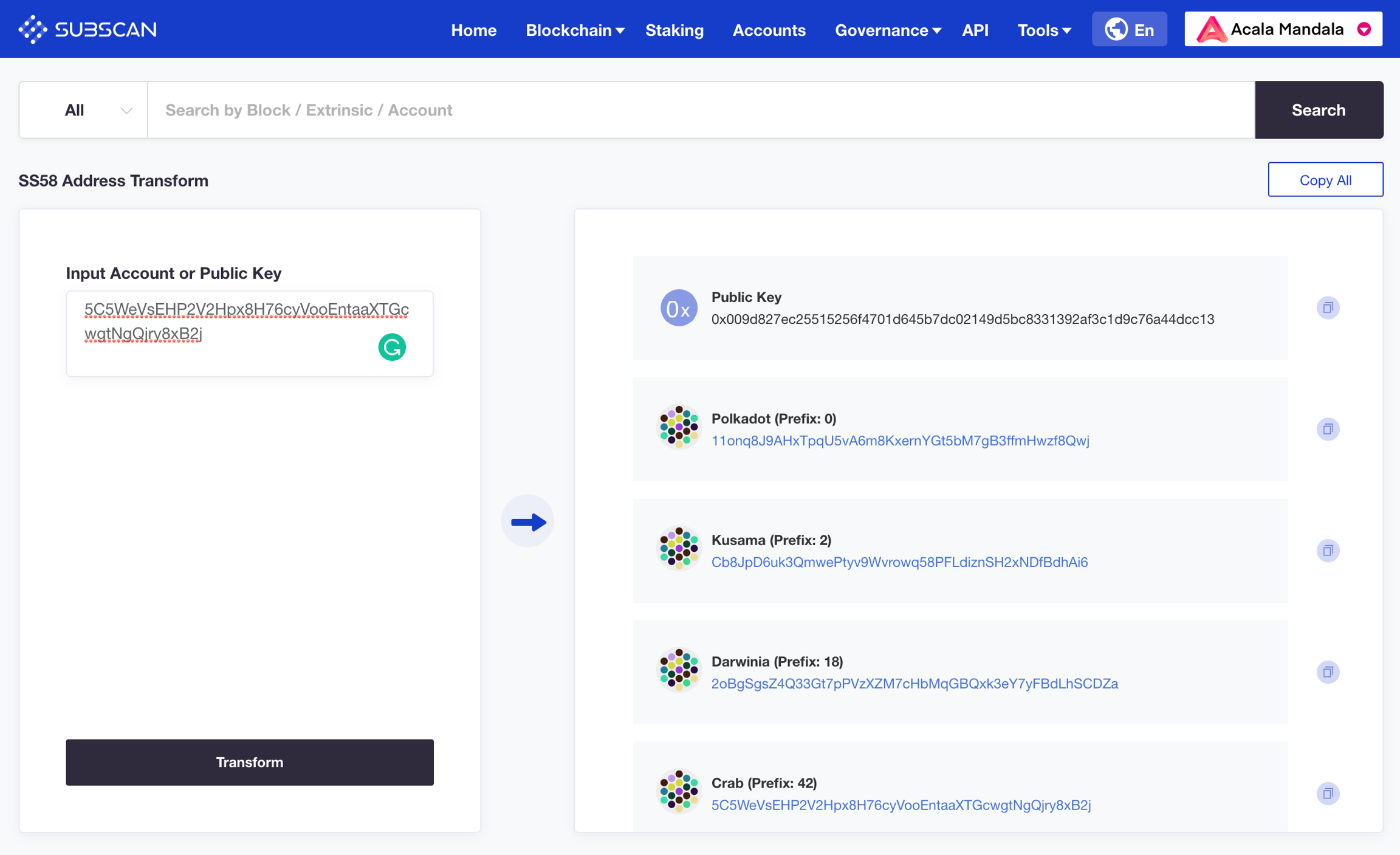 Navigate to Subscan Address Transform and paste your existing account address into "Input Account or Public Key".